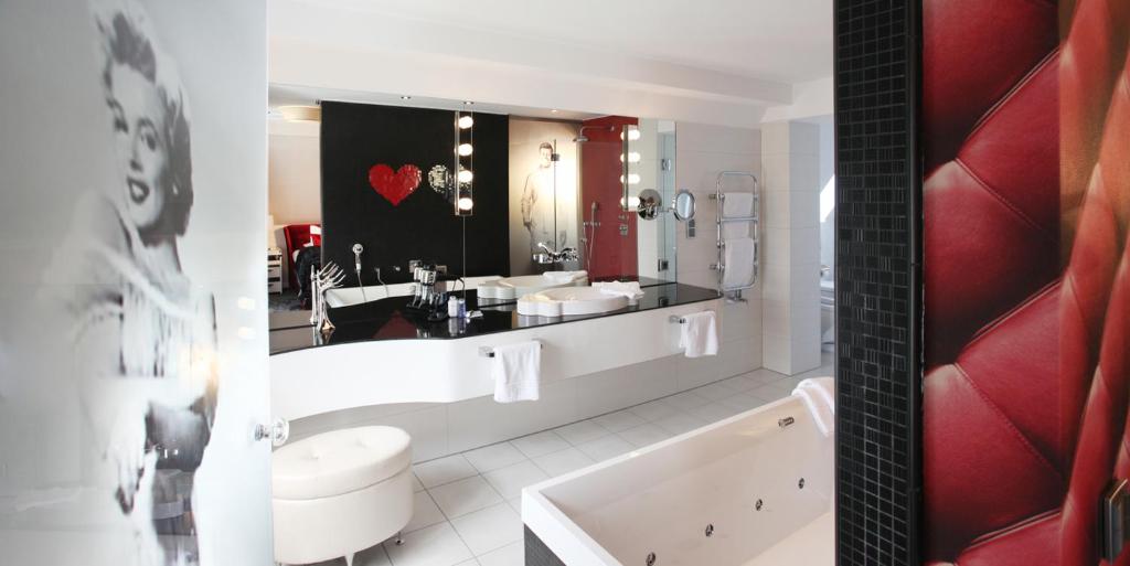 - Suite: Marilyn-Monroe-Suite im eleganten Boutique-Stil, freistehende Whirlpool-Badewanne im Zimmer, gemütlicher Schlaf- und Wohnbereich, hochwertige Ausstattung.