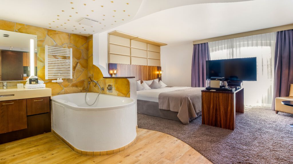 Im renommierten LIFESTYLE Resort Zum Kurfürsten gibt es spezielle Spa‑Suiten mit Whirlpool‑Badewanne und Sternenhimmel. Die modernen Suiten bieten auf rund 72 m² eine offene Badlandschaft mit Whirlpool‑Wanne, Dampfbad und Infrarot‑Licht sowie einen separaten Wohn‑ und Schlafbereich. Gäste genießen zusätzlich den hoteleigenen Wellnessbereich, vier Saunen und Innen‑/Außenpools.